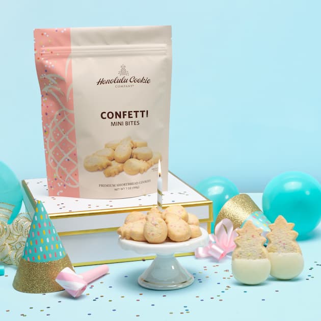 創業28周年の記念すべき機会を祝うのにふさわしい4月限定フレーバー・オブ・ザ・マンス「コンフェッティ」をご紹介。数量限定の本フレーバーは、バニラの甘い香りとバターのコクが特徴で、シュガークッキーやレインボースプリンクルを添えたバースデーケーキをイメージして再現しました。新登場のホワイトチョコレート・コンフェッティは、オンライン限定の「シングルフレーバーボックス (16枚入り)」または店頭の「ビルド・ユア・オウン・ボックス」ステーションにてお求めいただけます。さらに、ホノルル・クッキー・カンパニーの創業キャンペーンとして、期間限定の店頭特典を実施。コンフェッティ・ミニバイツ・スナックパックを2点ご購入いただくと、もう1点を無料でプレゼントいたします (在庫がなくなり次第終了)。季節限定のミニバイツは、ひと口サイズをみんなで楽しめるパッケージです。「コンフェッティ」フレーバーは、5月12日まで、または在庫がなくなり次第販売終了となります。