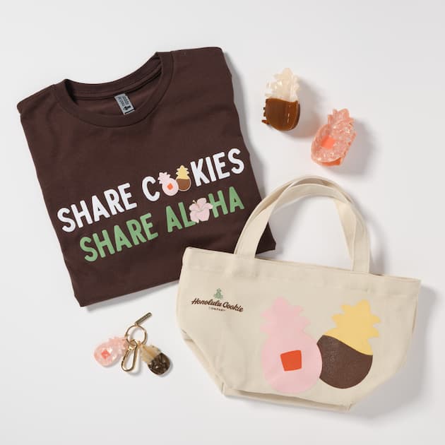 また4月15日には、「クッキーとアロハを世界へ届ける」という創業者の想いを記念し、新たなグッズも発売予定です。新規タグライン「Share Cookies, Share Aloha (クッキーをシェアして、アロハをシェアしよう)」をあしらったアイテムとして、Tシャツ (S~3XL)、スモールキャンバストートバッグ、ステッカーを、オンライン及び店頭で販売します。また、ハワイ限定コラボレーションの取り組みも拡大し、Keiki Kaukau とのパートナーシップにより、「Honolulu Cookie Company X Alohalandチャーム」が実現。鍵やバッグ、アクセサリーに甘いアクセントを添えます。