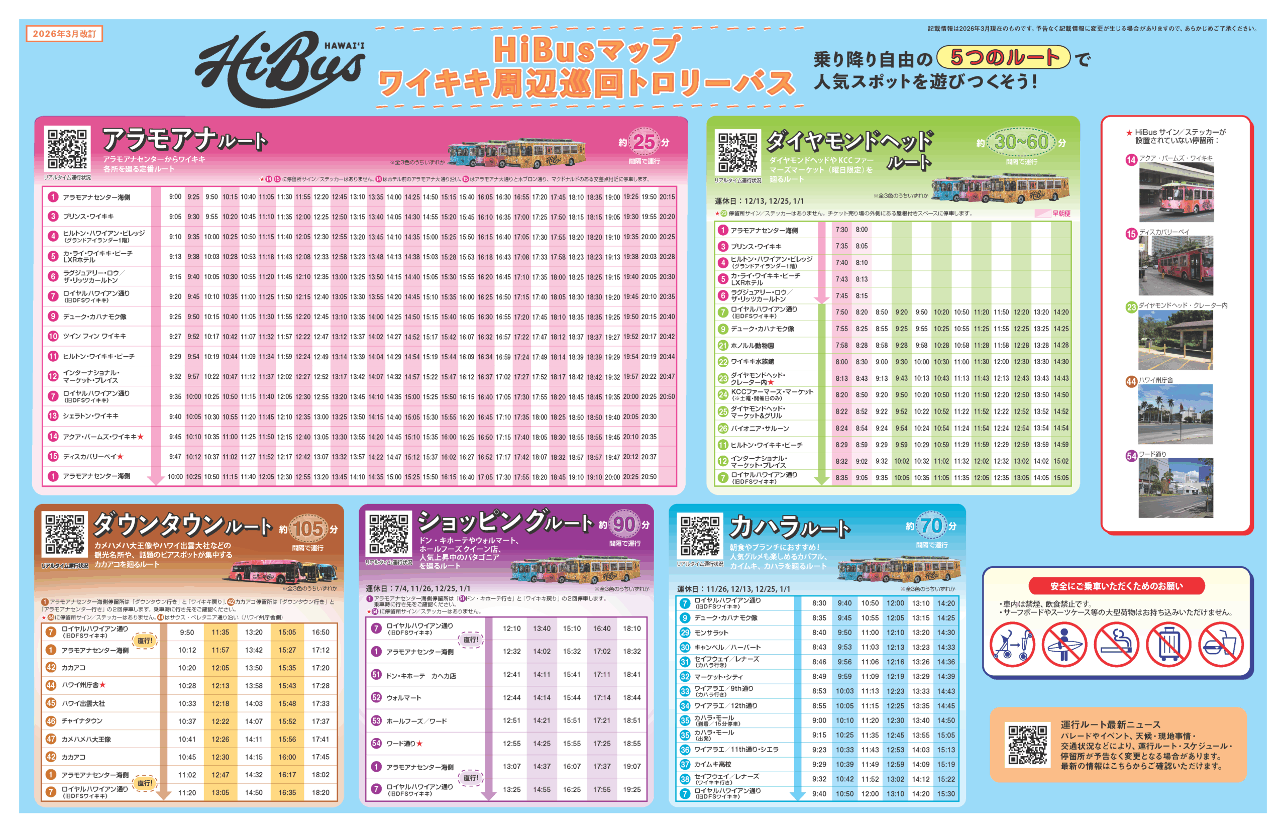 - ※現地事情、交通状況、天候等により運行ルート、運行間隔、所要時間、停留所、スケジュール、車種や車両デザインなどが変更となる場合がありますので、必ず最寄りのJALパックアロハステーションにてご確認ください。