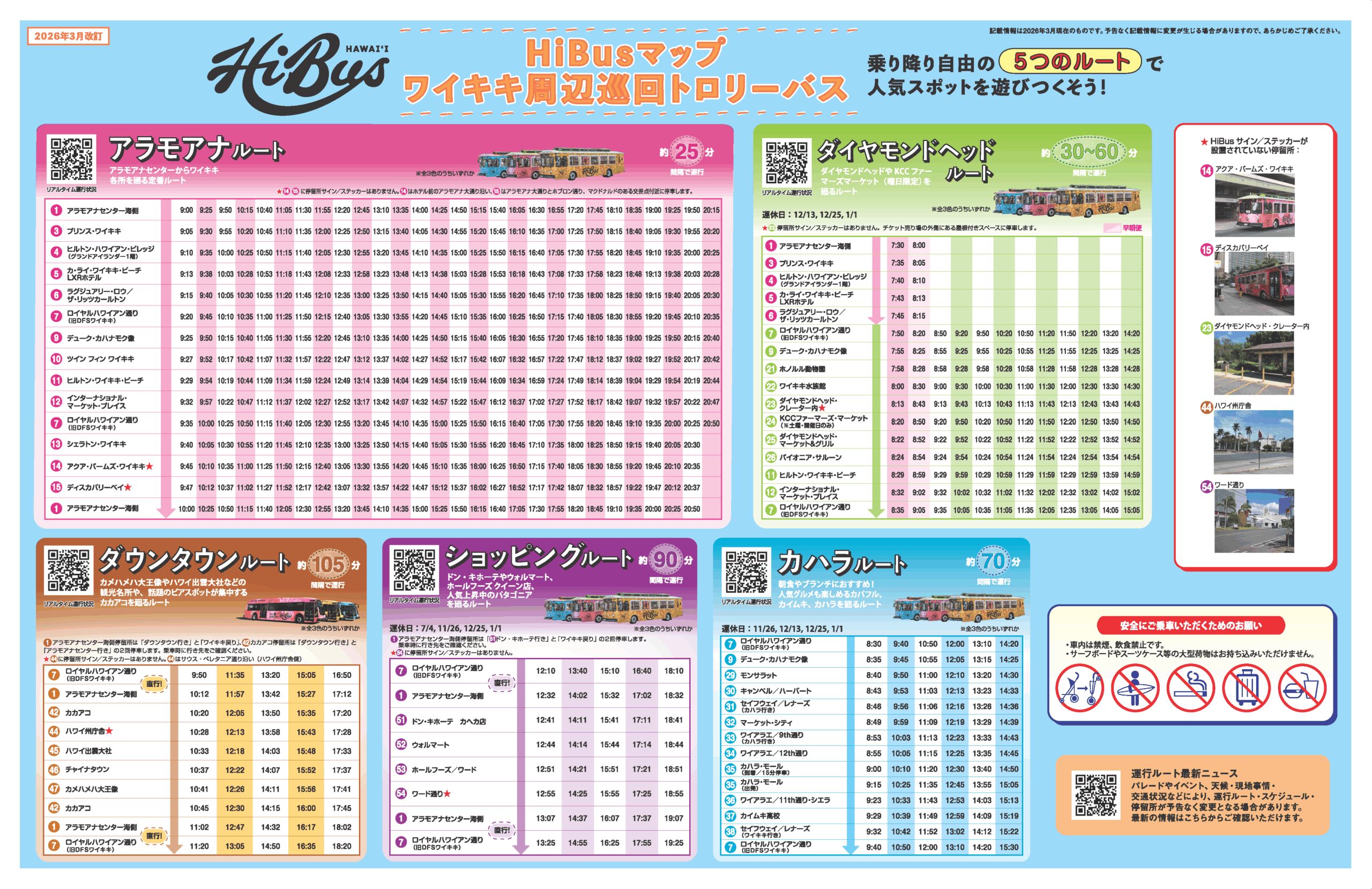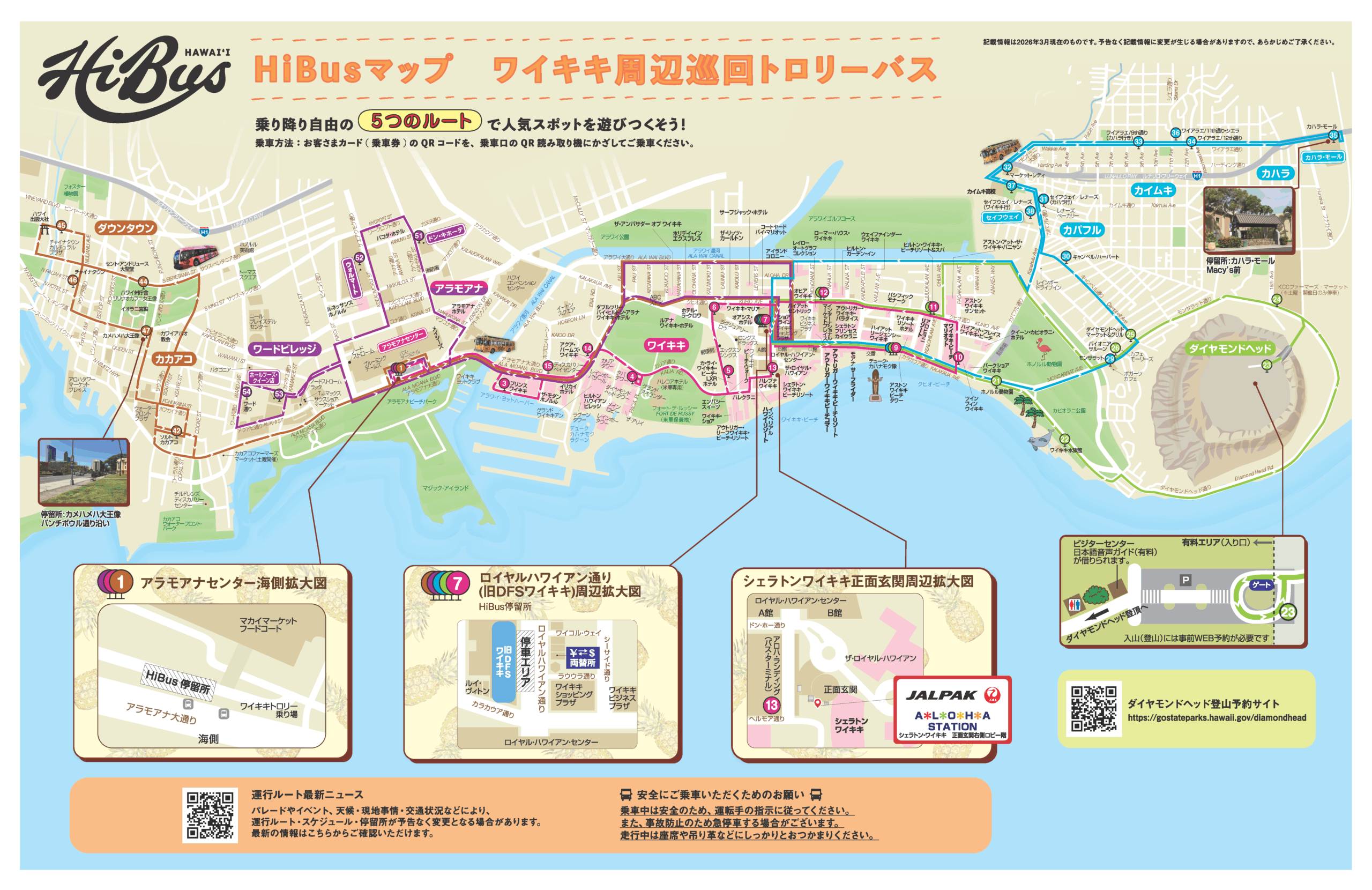 • ※現地事情、交通状況、天候等により運行ルート、運行間隔、所要時間、停留所、スケジュール、車種や車両デザインなどが変更となる場合がありますので、必ず最寄りのJALパックアロハステーションにてご確認ください。